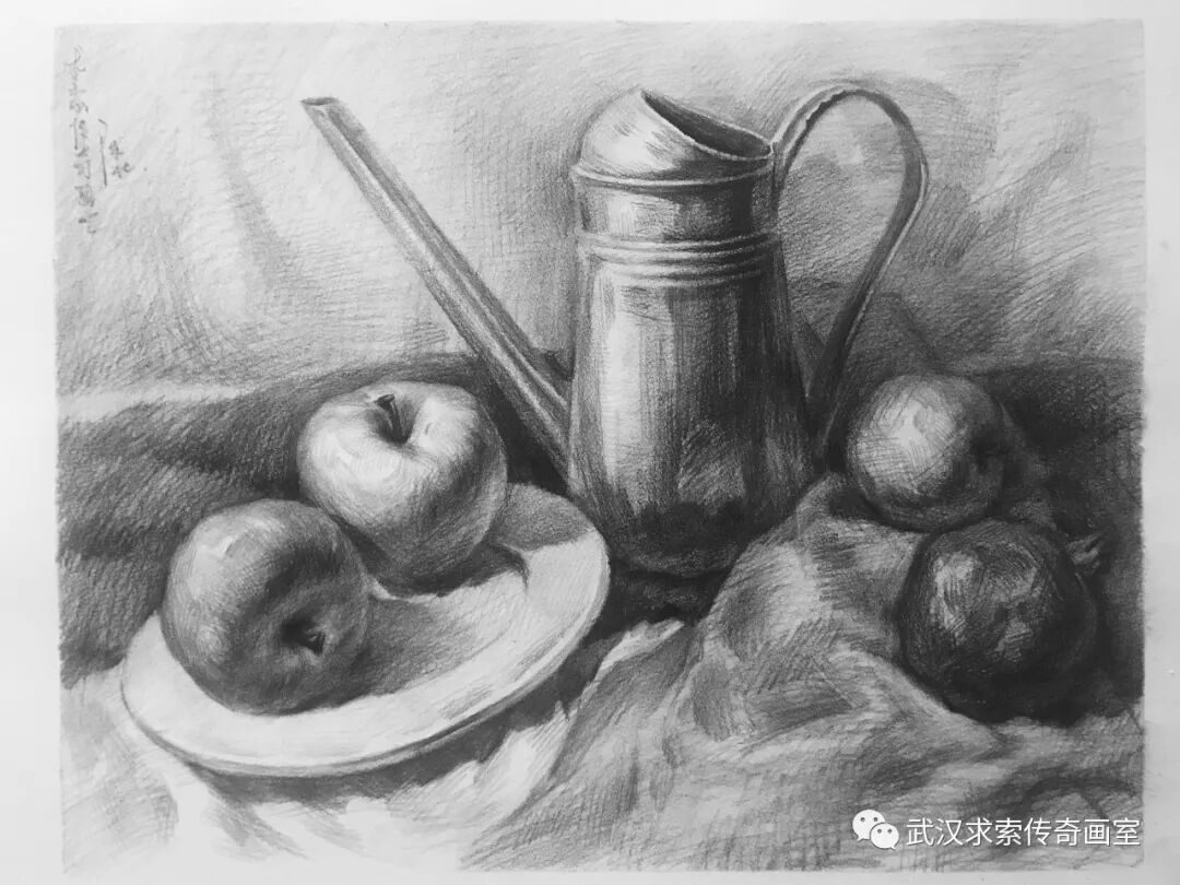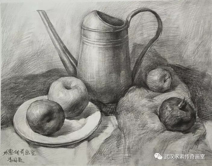 这次考题物体比较常规,铁质的壶,苹果,都是考生平时练习较多的物体。在考题中,让考生头疼的可能就是画面衬布的处理和黑白灰的颜色区分。几个相同苹果的颜色,主题物和衬布的颜色关系。有一部分考生是进行自由构图了。这个对于基础好的学生可以。对于基础弱的学生,还是建议照着图片画就可以了,物体落脚点进行微调。对于本次素描考试,学生层次可能拉得不太开,都能画得出来一个大概。对于好的学生,还是得看对物体的塑造和质感的体现。
