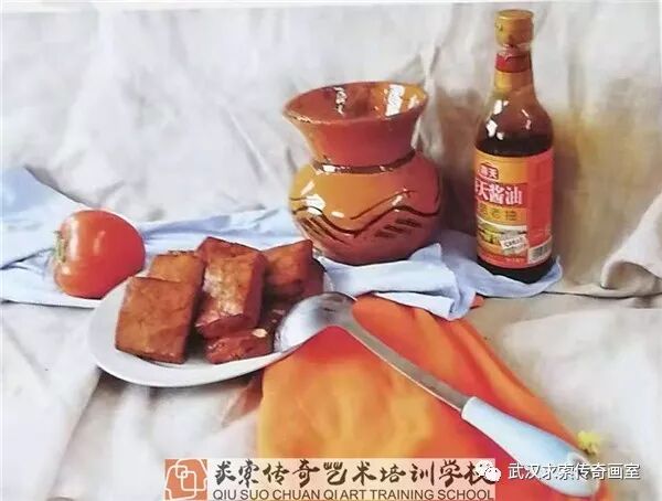 (3)视觉中心的塑造和画面感的营造也需要好好处理下,瓶子和罐子要选择一个作为第一主体物,要画的深入完整些,豆干选几块画就可以了,不需要画一整盘,衬布的转折起伏也是要表达的。